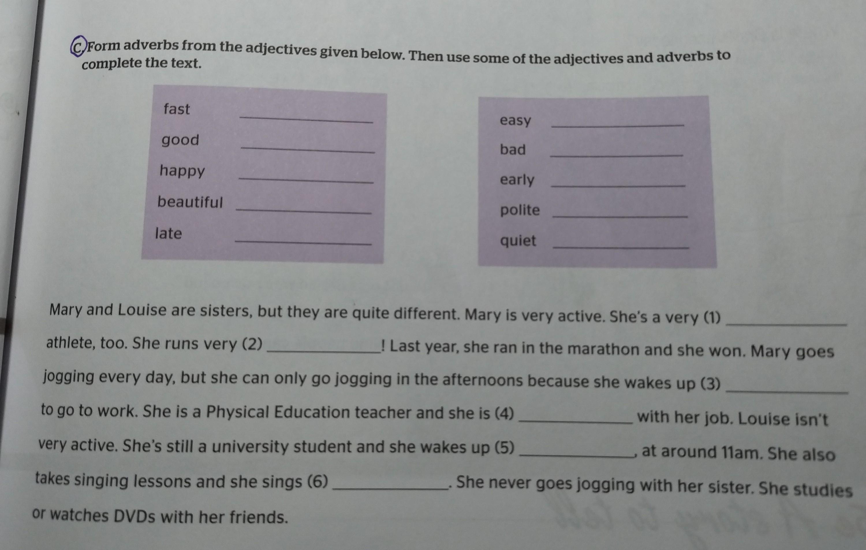 Form adverbs from the adjectives given below. Then use some of the adjectives and adverbs to complete the text. fast good happy beautiful late easy bad early polite quiet Mary and Louise are sisters, but they are quite different. Mary is very active. She's a very (1) athlete, too. She runs very (2) jogging every day, but she can only go jogging in the afternoons because she wakes up (3) to go to work. She is a Physical Education teacher and she is (4) very active. She's still a university student and she wakes up (5) takes singing lessons and she sings (6) or watches DVDs with her friends. ! Last year, she ran in the marathon and she won. Mary goes with her job. Louise isn't at around 11am. She also She never goes jogging with her sister. She studies помогите очень срочно даю 50 балов