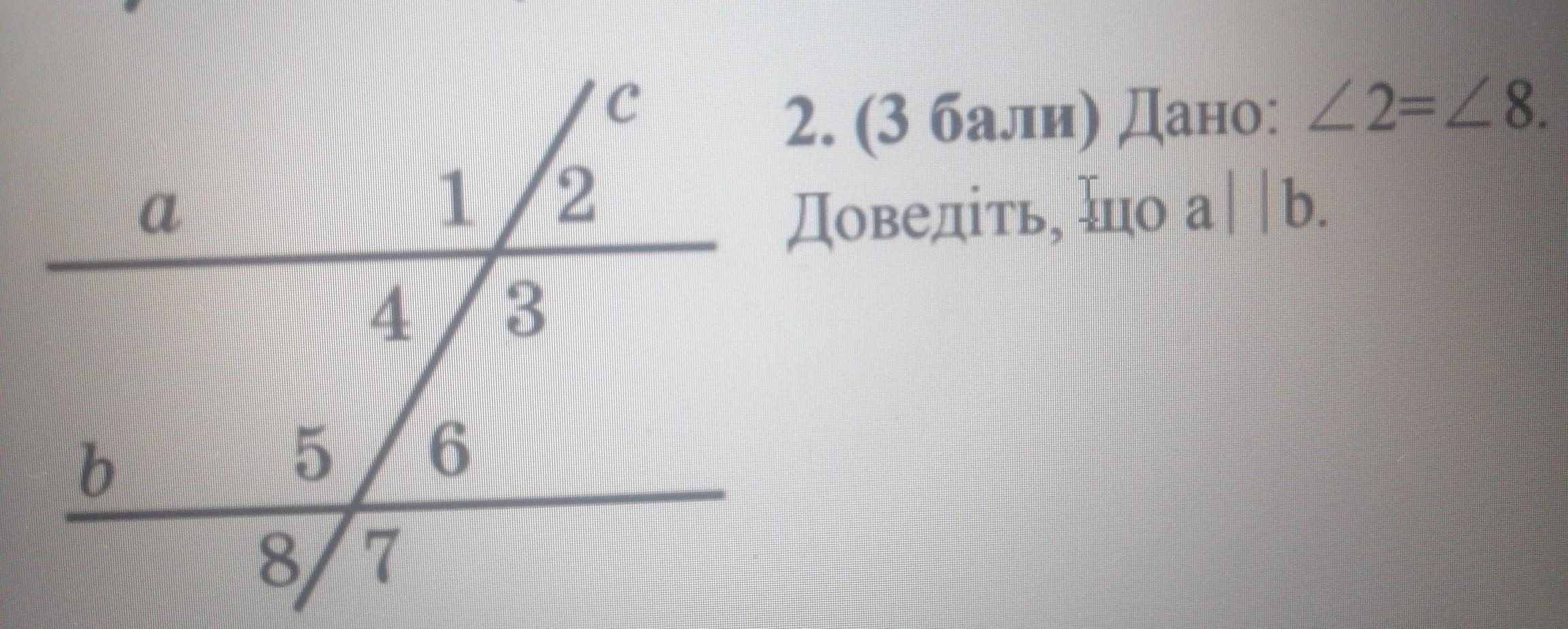 кут 2 дорівнює куту 8, кут 2 дорівнює куту 4 як вертикальні, 8 дорівнює 6 як вертикальні, отже, кут 6 і кут 4 рівні, а вони внутрішні різносторонні, отже, прямі а і в паралельні