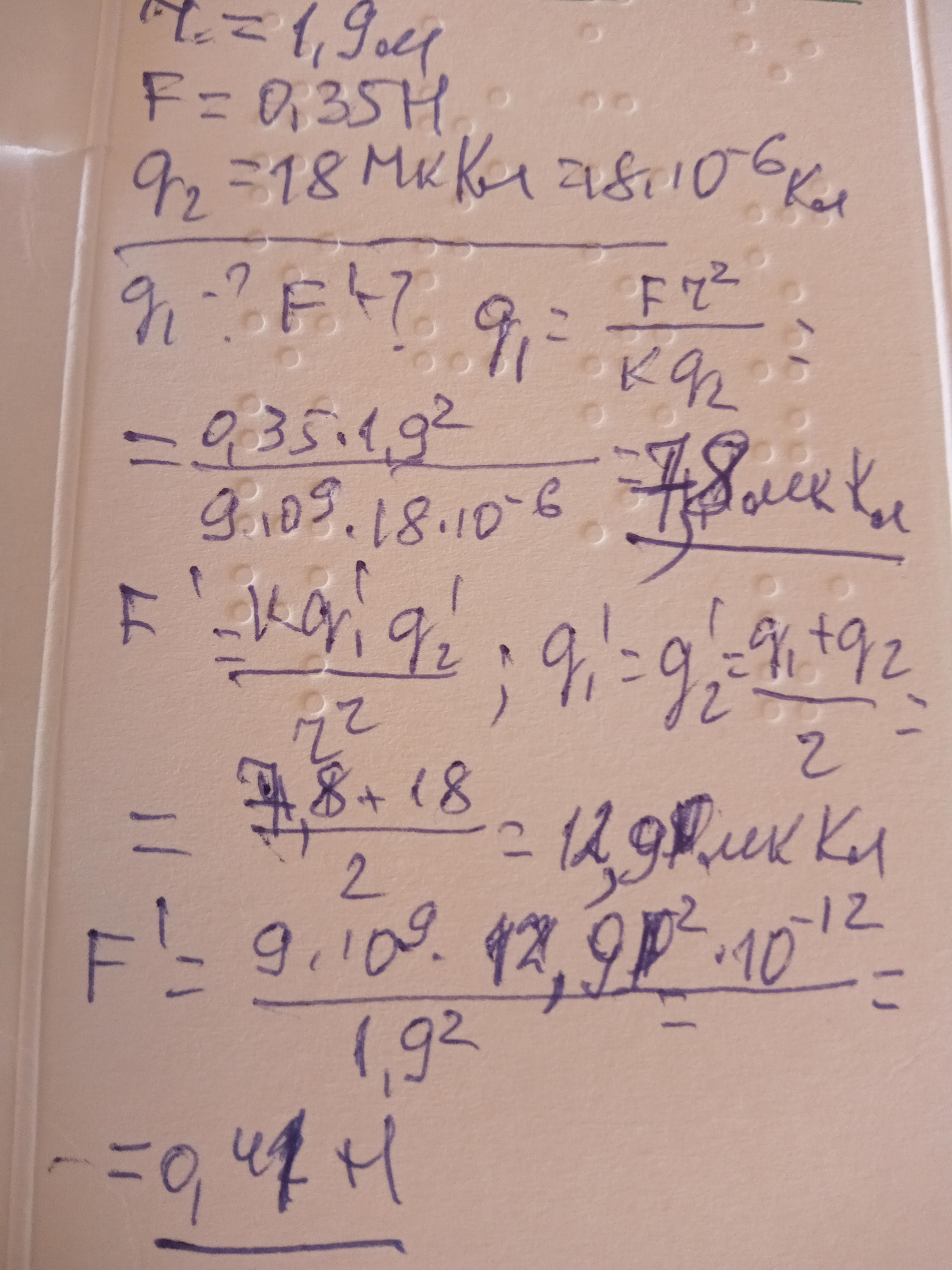 Дві однакові однойменно заряджені кульки, розташовані на відстані 1,9 м одна від одної, взаємодіють із силою 0,35 Н. Заряд другої кульки дорівнює +18 мкКл. Визначте заряд першої кульки. Обчисліть, якою буде сила електростатичної взаємодії кульок після того, як вони торкнуться одна одної й знову розійдуться на таку саму відстань. (3 бали)