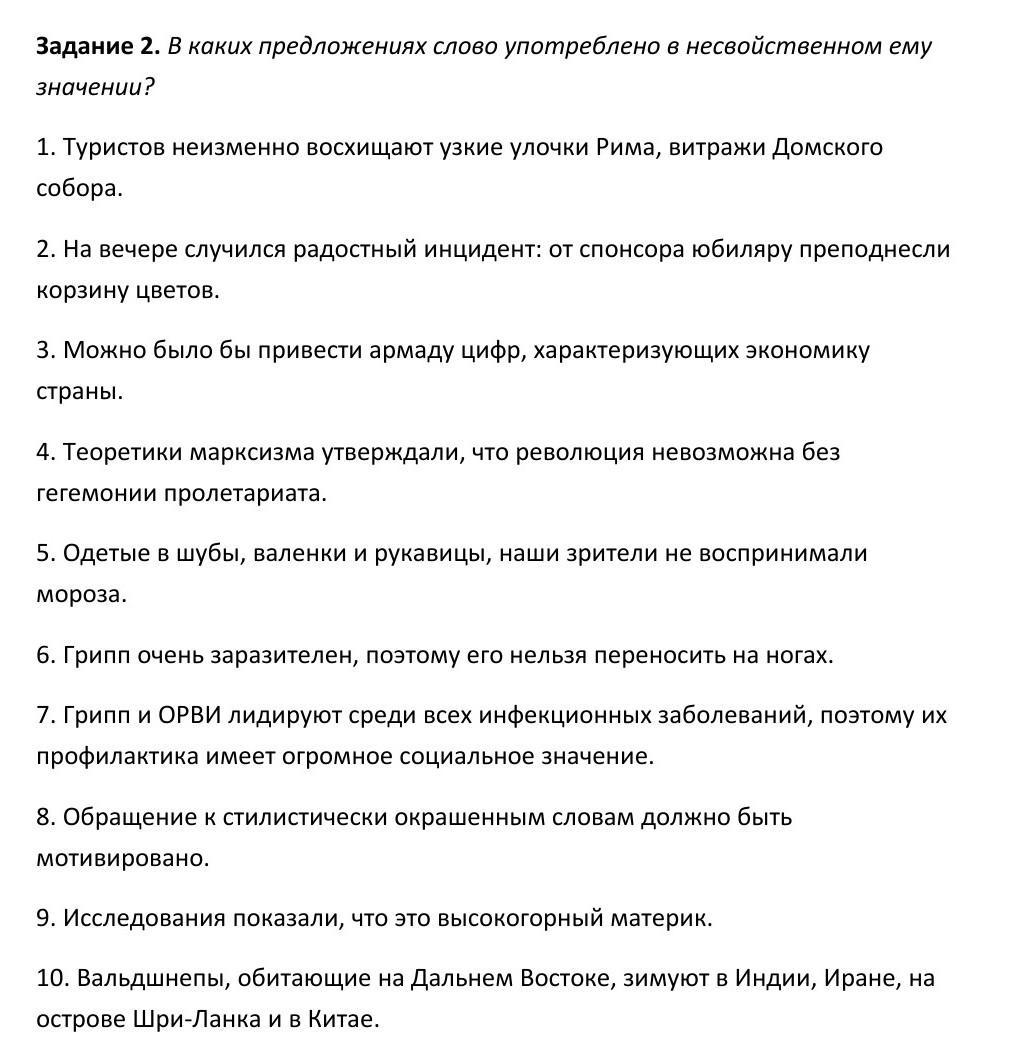 Задание 2. В каких предложениях слово употреблено в несвойственном ему значении? 1. Туристов неизменно восхищают узкие улочки Рима, витражи Домского собора. 2. На вечере случился радостный инцидент: от спонсора юбиляру преподнесли корзину цветов. 3. Можно было бы привести армаду цифр, характеризующих экономику страны. 4. Теоретики марксизма утверждали, что революция невозможна без гегемонии пролетариата. 5. Одетые в шубы, валенки и рукавицы, наши зрители не воспринимали мороза. 6. Грипп очень заразителен, поэтому его нельзя переносить на ногах. 7. Грипп и ОРВИ лидируют среди всех инфекционных заболеваний, поэтому их профилактика имеет огромное социальное значение. 8. Обращение к стилистически окрашенным словам должно быть мотивировано. 9. Исследования показали, что это высокогорный материк.