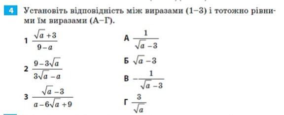 4 Установіть відповідність між виразами (1-3) і тотожно рiвни- ми ïм виразами (А-Г).
