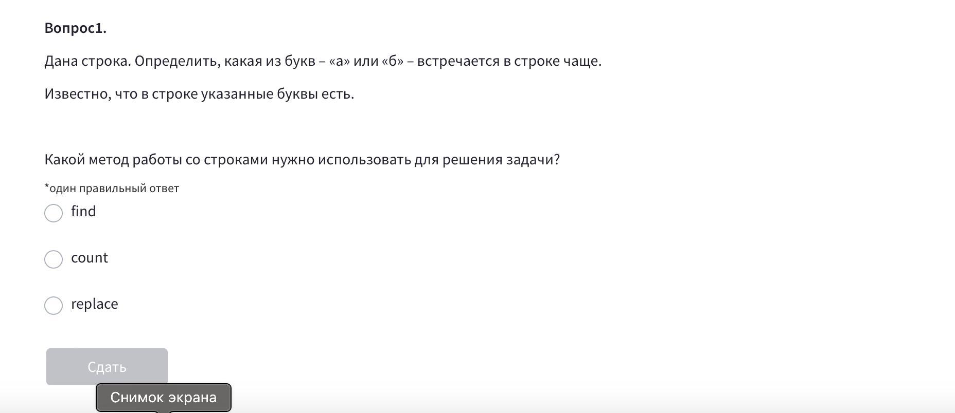 - Метод str.count(a) возвращает количество вхождений подстроки a в строке str. Этот метод нам подходит, так как необходимо найти количество всех вхождений подстрок "а" и "б" в строке.