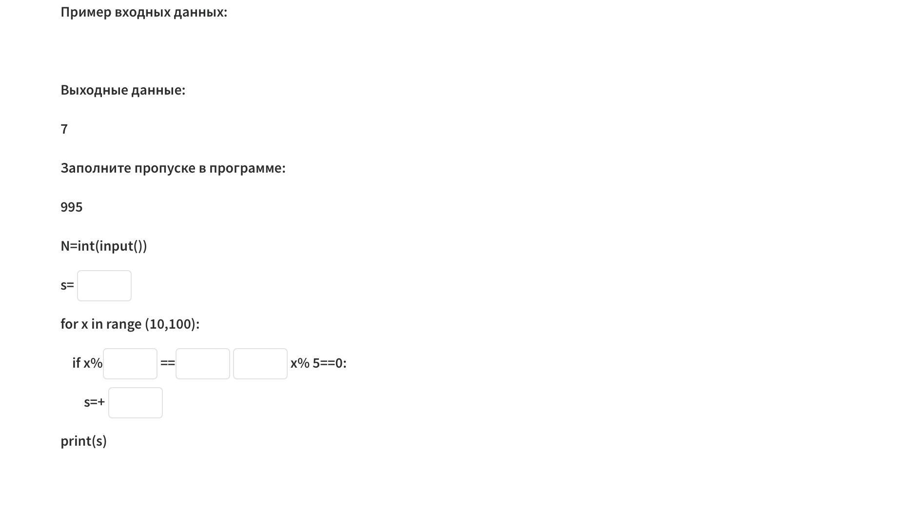 Данное задание максимально бесполезное, так как проверяет лишь способность ученика "угадать" ответ. Я не смог подобрать правильные значения к пробелам, чтобы ответ сошелся, но вот примерный код решения: