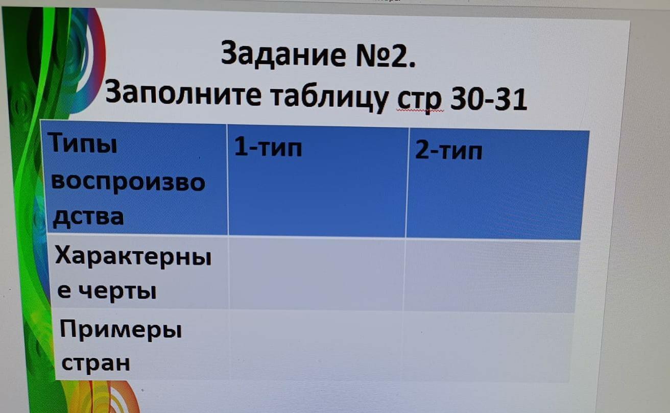 Задание №2. Заполните таблицу стр 30-31 2-тип Типы воспроизво дства Характерны е черты Примеры стран 1-тип В
