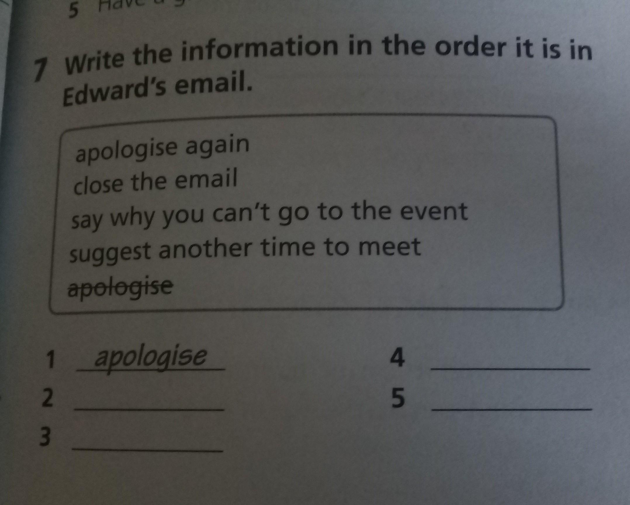 5 Have a gr 7 Write the information in the order it is in Edward's email. apologise again dose the email say why you can't go to the event suggest another time to meet 1.apelegise 2.? 3.? 4.? 5.?