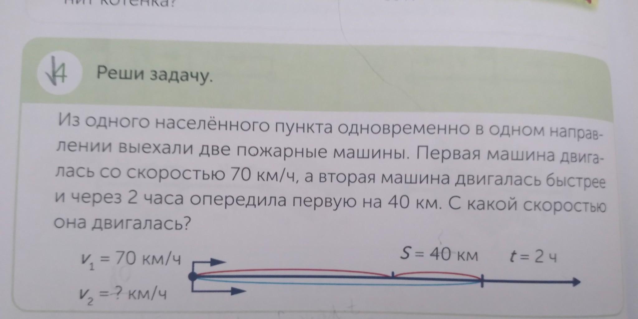 И Реши задачу. Из одного населённого пункта одновременно в одном направ- лении выехали две пожарные машины. Первая машина двига- лась со скоростью 70 км/ч, а вторая машина двигалась быстрее и через 2 часа опередила первую на 40 км. С какой скоростью она двигалась? S= 40 км t=2ч v = 70 км/ч V₂ = ? KM/4