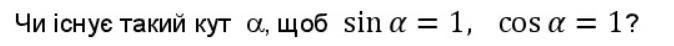 Существует ли такой угол α, чтобы sinα=1, cosα=1, фото прикрепил, даю 50 баллов