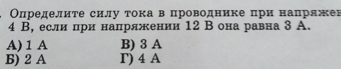 2. Определите силу тока в проводнике при напряжении 4 В, если при напряжении 12 В она равна 3 А. A)1 A Б) 2 А B) 3 А Г) 4 А