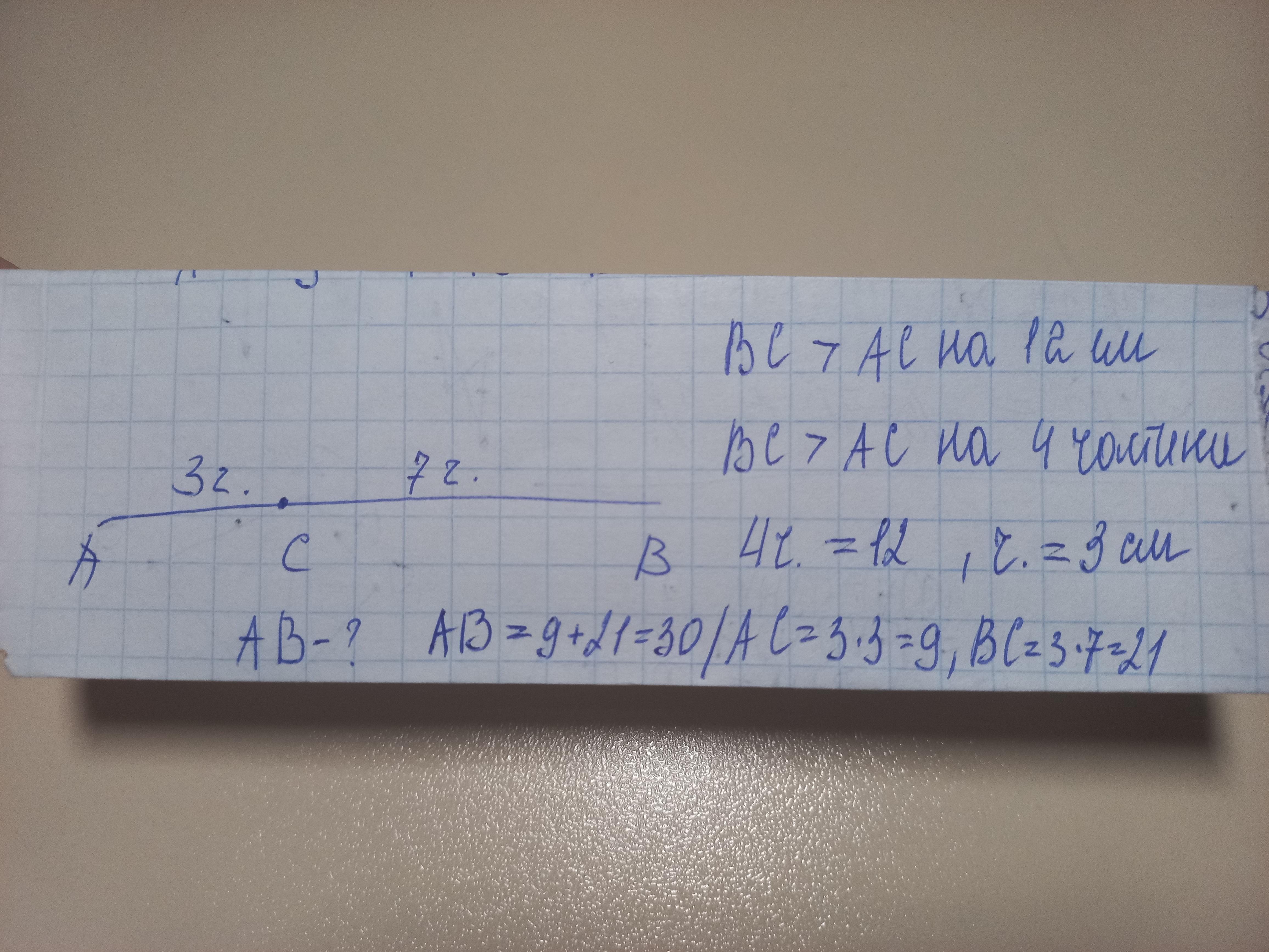 3. Точка С ділить відрізок АB у відношенні 3: 7. Знайдіть довжину відрізка AB, якщо вiдрiзок ВС більше відрізка АС на 12 см.
