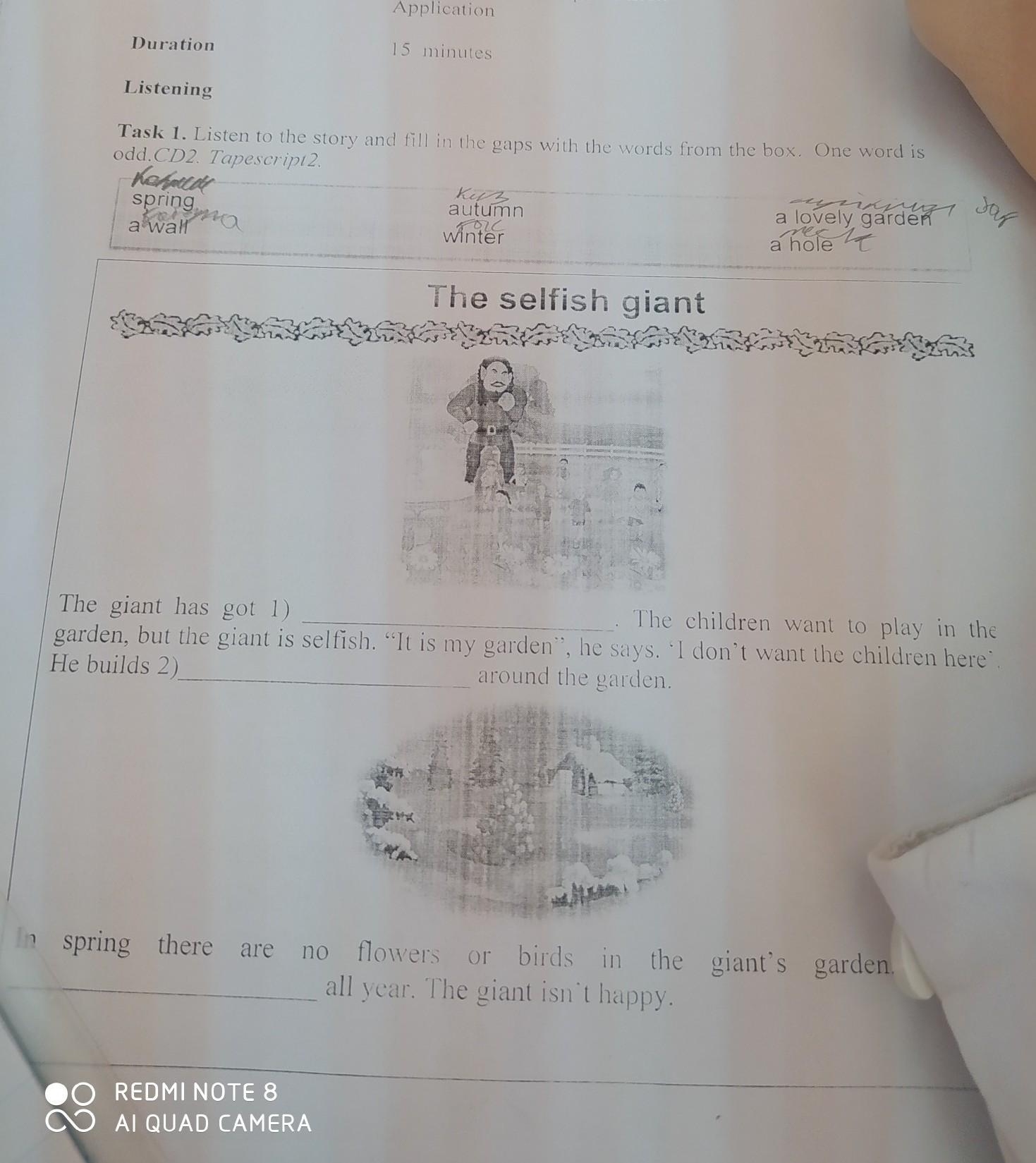 odd. CD2. Tapescript2. Kahrede spring a wall Киз autumn FOLL winter The selfish giant a lovely garden a hole sag The giant has got 1) The children want to play in the garden, but the giant is selfish. "It is my garden", he says. "I don't want the children here around the garden. He builds 2). пжжжжж,быстрее,даю 100 балов