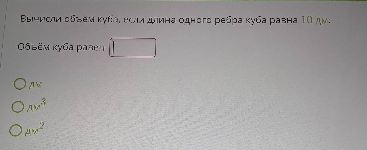 Вычисли объём куба, если длина одного ребра куба равна 10 дм. Объём куба равен | Одм Одм3 О дм2