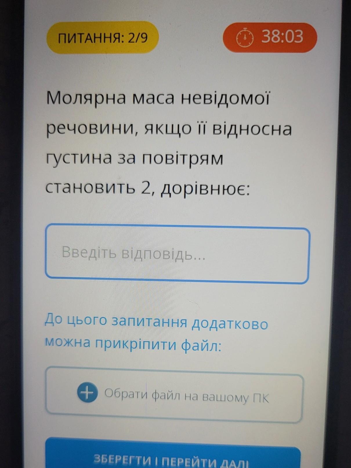 ПИТАННЯ: 2/9 Молярна маса невідомої речовини, якщо її відносна густина за повітрям становить 2, дорівнює: Введіт 38:03 повіль
