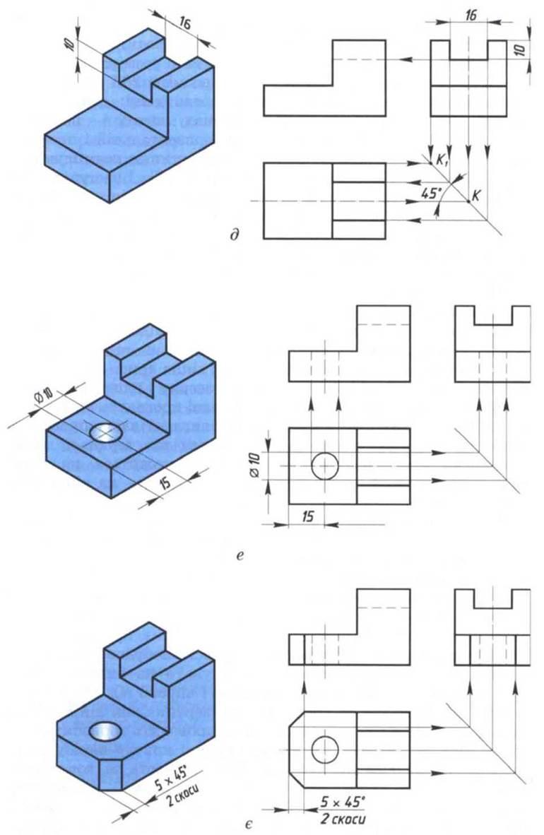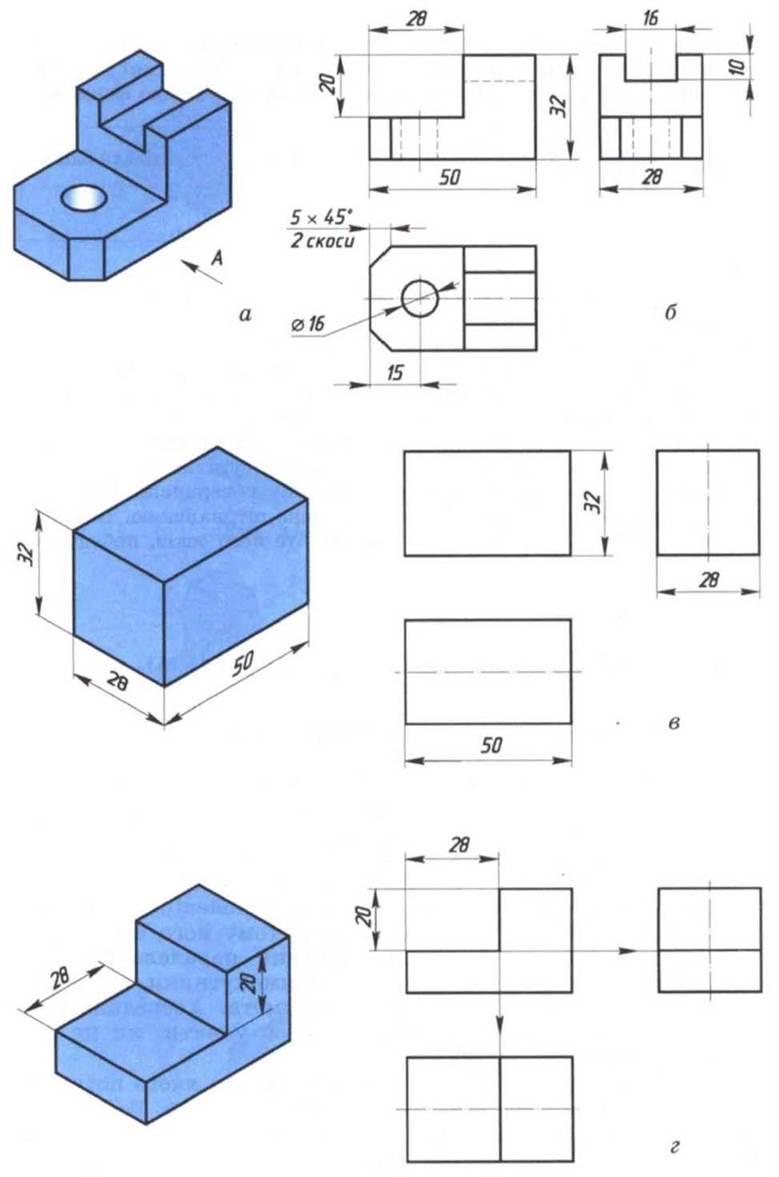 Рис. 84. Послідовність побудови виглядів на кресленні предметаПроекції цього паралелепіпеда являють собою прямокутники (рис. 84, в). На фронтальній площині проекцій прямокутник визначає довжину і висоту предмета, тобто розміри 50 і 32, на горизонтальній — довжину і ширину, тобто розміри 50 і 28, на профільній — ширину і висоту, тобто розміри 28 і 32. Кожний вимір предмета показано без спотворень двічі: довжину на фронтальній і горизонтальній площинах, висоту — на фронтальній і профільній, ширину — на горизонтальній і профільній площинах проекцій. Всі три прямокутники розміщують у проекційному зв’язку. Контури прямокутників і наступні побудови усередині них виконують спочатку тонкими лініями. Оскільки предмет симетричний відносно вертикальної поздовжньої площини, то на виглядах зверху і зліва повинні бути осі симетрії. Для цього на прямокутниках, які дістали на горизонтальній і профільній площинах проекцій, проводять штрихпунктирні лінії.Предмет має два прямокутних вирізи — один з лівого боку і другий зверху уздовж предмета. Лівий виріз починають будувати на головному вигляді. Для цього на відстані 28 мм від лівої грані проводять вертикальну лінію, а на відстані 20 мм від верхньої грані — горизонтальну лінію (рис. 84, г). Далі будують проекції вирізу на виглядах зверху і зліва. На вигляді зверху на відстані 28 мм від лівої грані проводять вертикальну лінію, паралельну цій грані. На вигляді зліва проводять горизонтальну лінію на відстані 20 мм від верхньої грані. Проведена лінія на вигляді зверху знаходиться на рівні вертикальної грані зрізу, а на вигляді зліва — на рівні його горизонтальної грані.