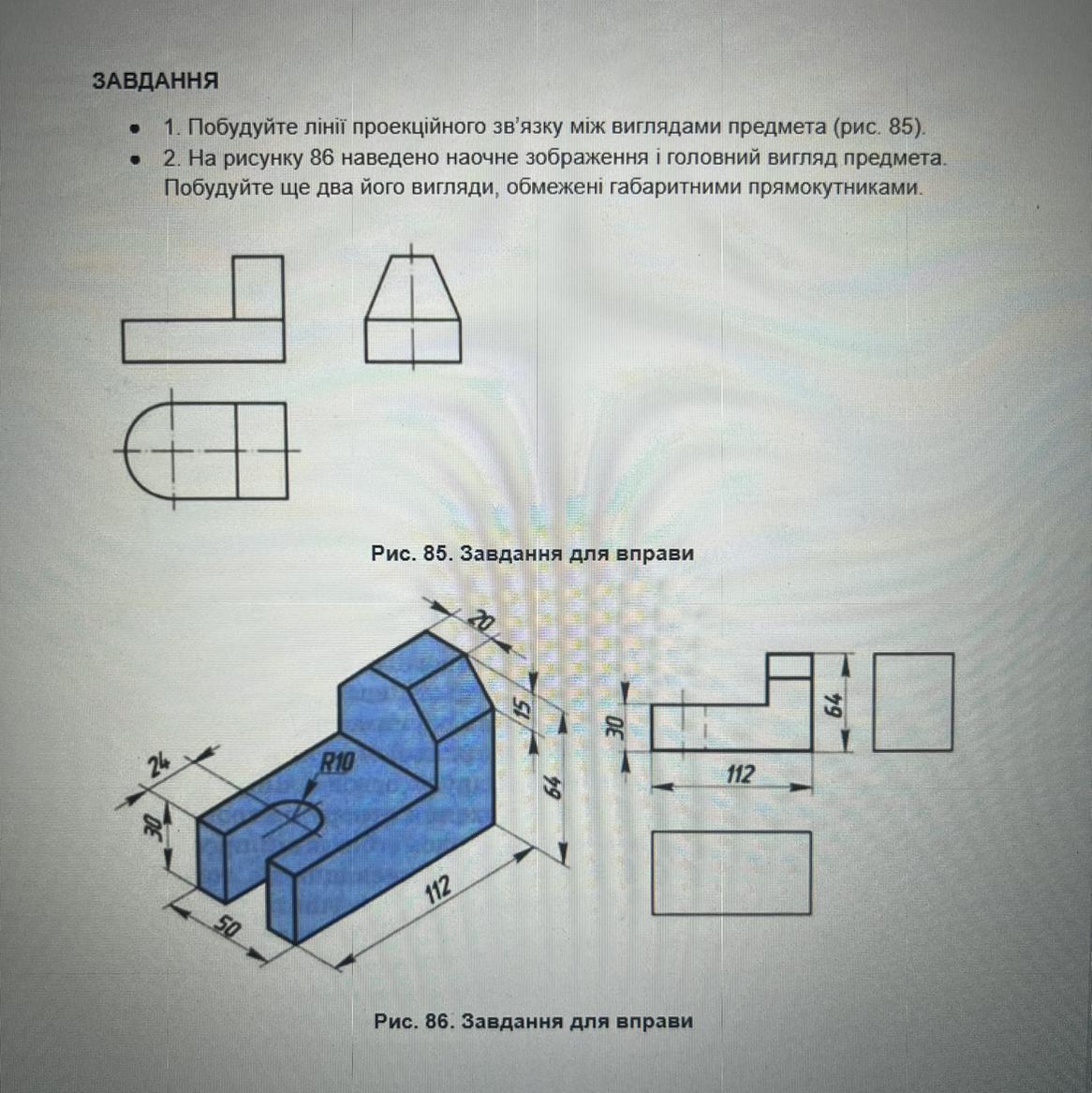 1. Побудуйте лінії проекційного зв'язку мiж виглядами предмета (рис. 85).