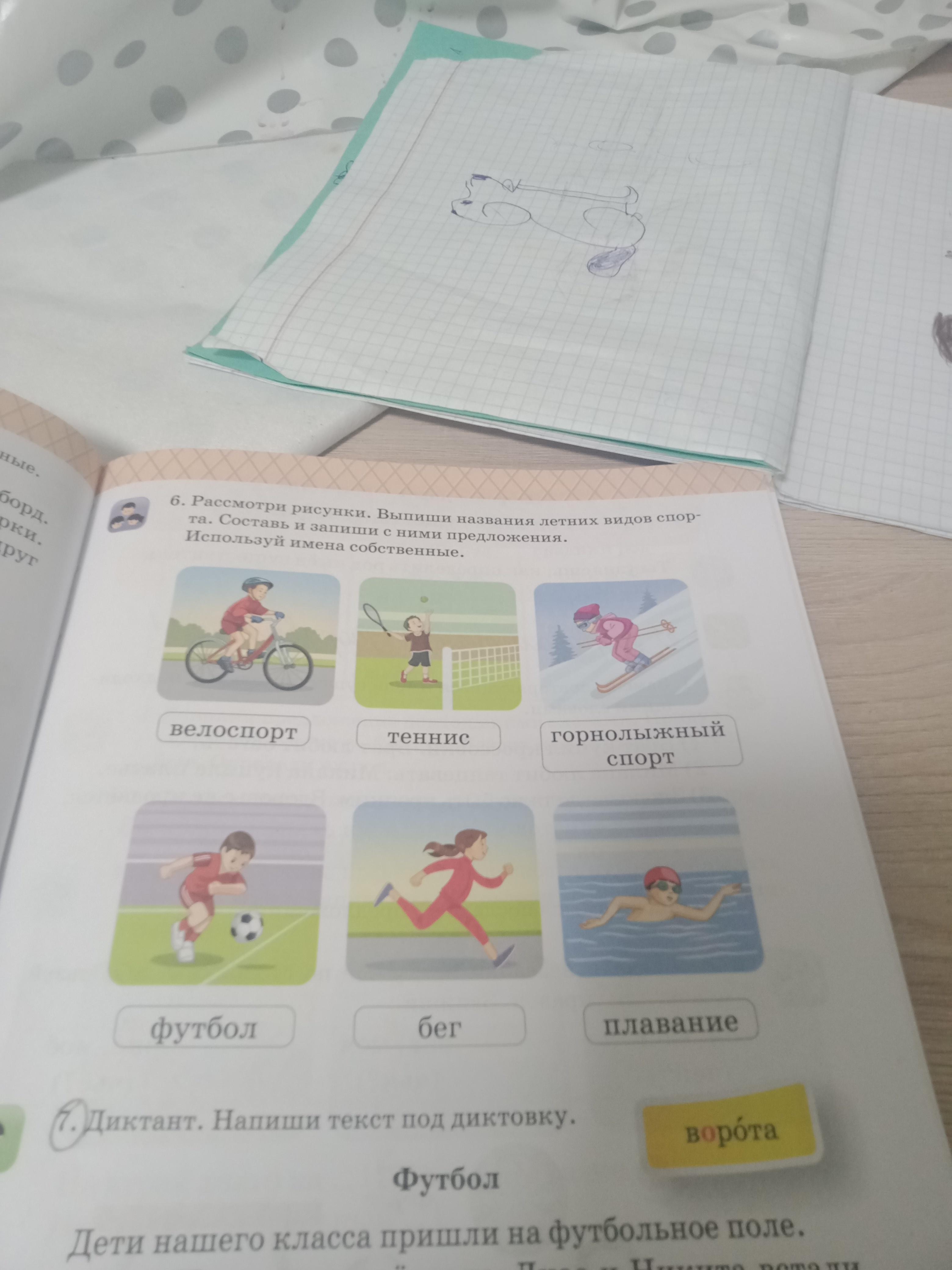 1. cycling 2. tennis 3. skiing 4. football 5. running 6. swimming
