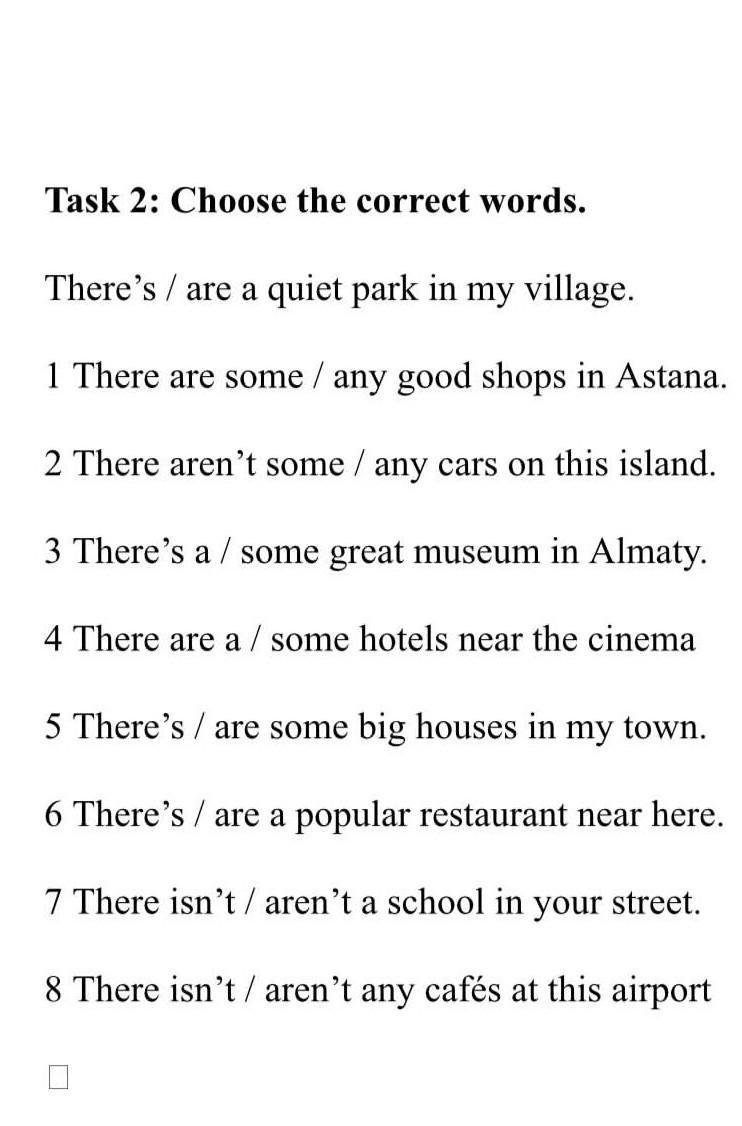 Task 2: Choose the correct words. There's are a quiet park in my village. 1 There are some / any good shops in Astana. 2 There aren't some / any cars on this island. 3 There's a / some great museum in Almaty. 4 There are a / some hotels near the cinema 5 There's are some big houses in my town. 6 There's are a popular restaurant near here. 7 There isn't/ aren't a school in your street. 8 There isn't/ aren't any cafés at this airport