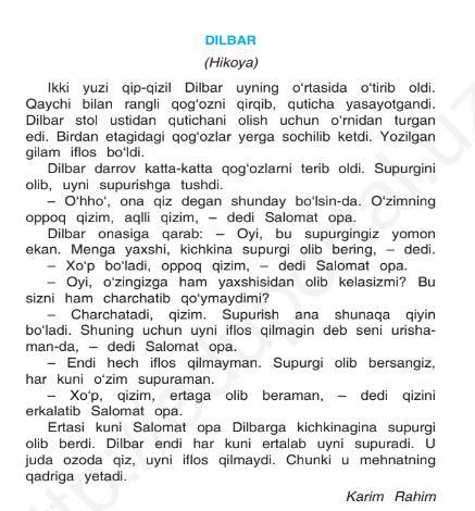 Привет сестра. На следующий день сестра Саломат принесла Дилбар маленькую метлу. Дилбар теперь подметает дом каждое утро. Она очень аккуратная девушка, не загрязняет дом. Потому что это работа