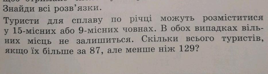 Туристи для сплаву по річці модуль розміститися у 15 місних човнах в обох випадках вільних місць не залишиться Скільки всього туристів якзо їх більше за 87 Але меньше ніш 129 пж допоможіть