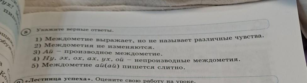 Укажите верные ответы. 1) Междометие выражает, но не называет различные чувства. 2) Междометия не изменяются. 3) Ай 4) Ну, эх, ох, ах, ух, ой непроизводные междометия. 5) Междометие ай(ай) пишется слитно. естница успеха». Оцените свою работу на уроке. - производное междометие.