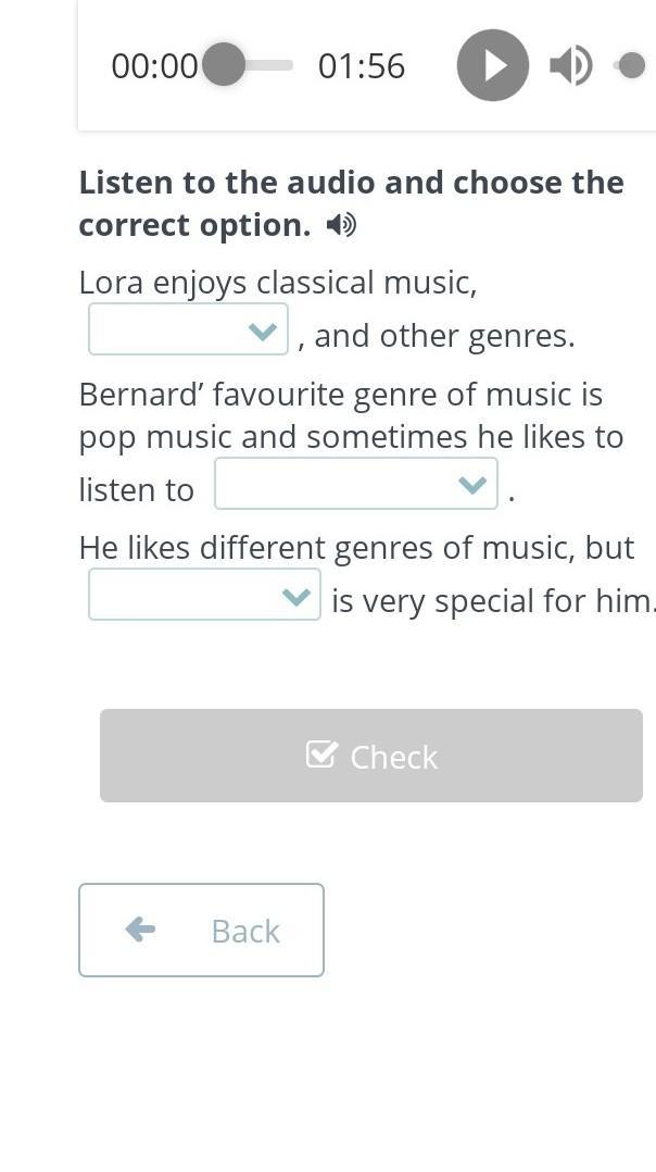 Listen to the audio and choose the correct option. Lora enjoys classical music, and other genres. Bernard' favourite genre of music is pop music and sometimes he likes to listen to He likes different genres of music, but is very special for him.