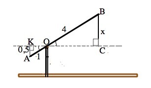 Короткое плечо шлагбаума имеет длину 1м, а длинное плечо- 4м. На какую высоту поднимается конец длинного плеча, когда конец короткого опускается на 0.5м