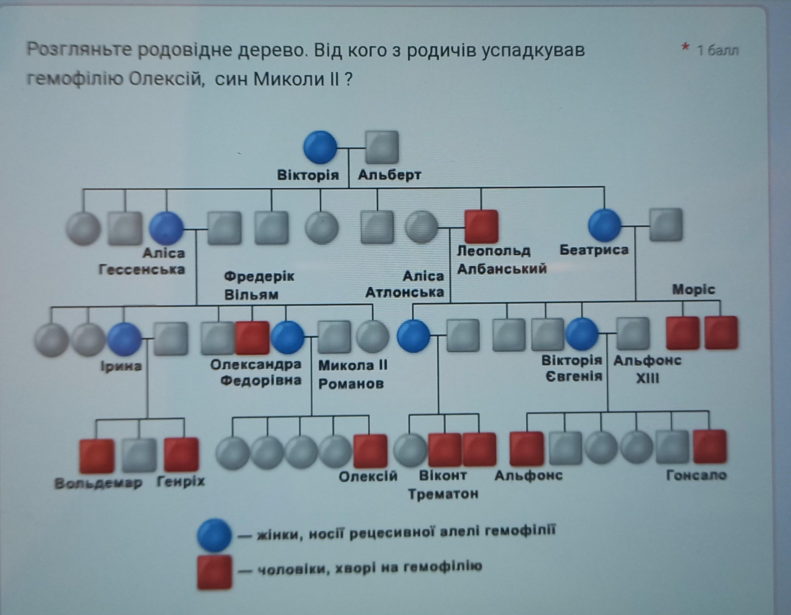 Розгляньте родовідне дерево. Від кого з родичів успадкував гемофілію Олексій, син Миколи II ?