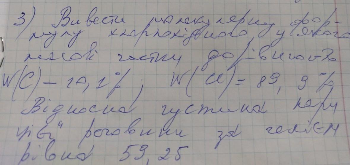 Виведіть молекулярну формулу хлорпохідного насиченого вуглеводню з масовою частою w(cl)-89,9 %, w(c) – 10,1 %. Відносна густина парів речовини за галієм 59.25