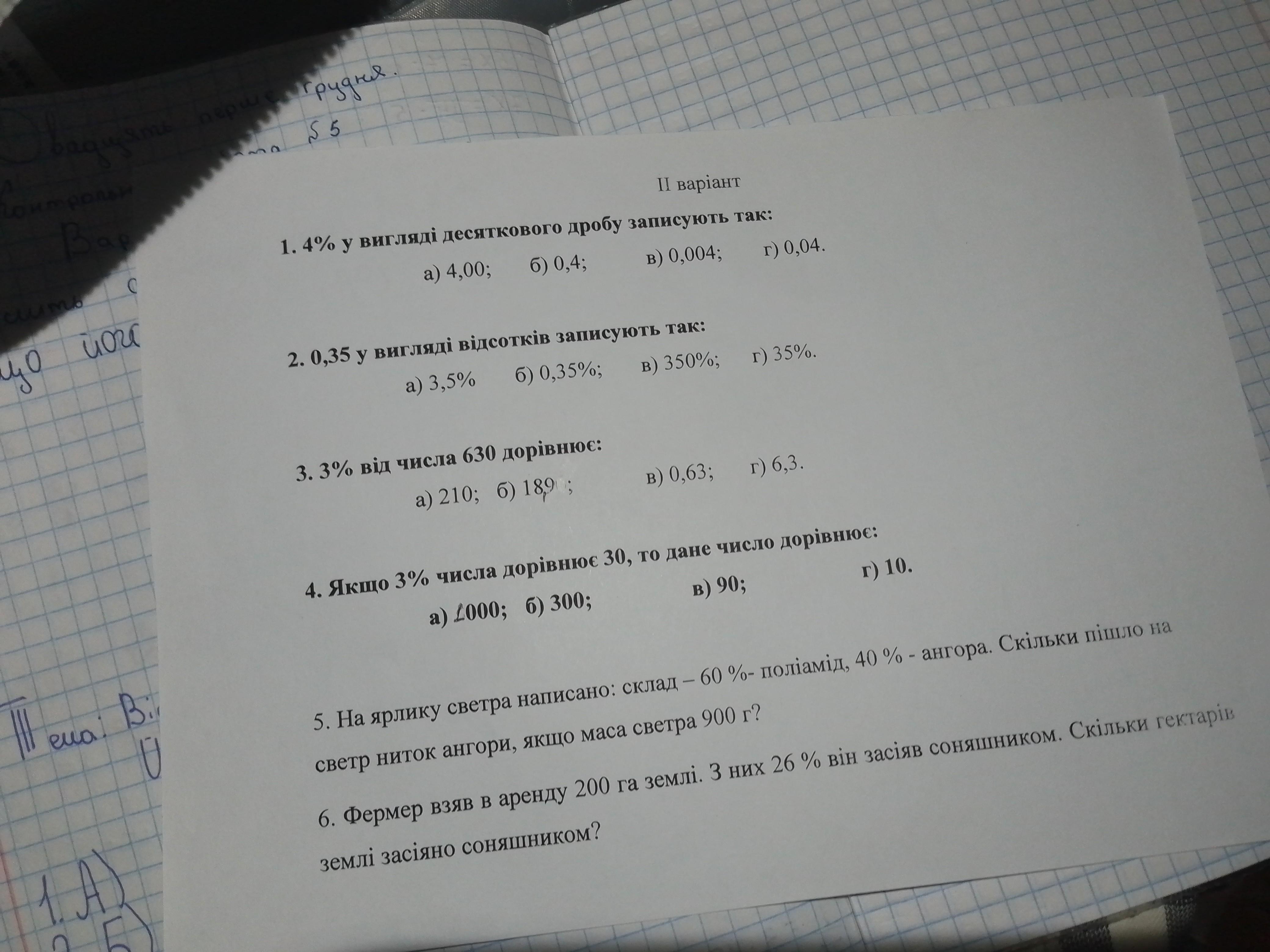 Ответ:1)г)0,04; 2)б)0,35%; 3)б)18,9; 4)а)1000 5) 360г на ангори 6) 52га - засеяно соняшником