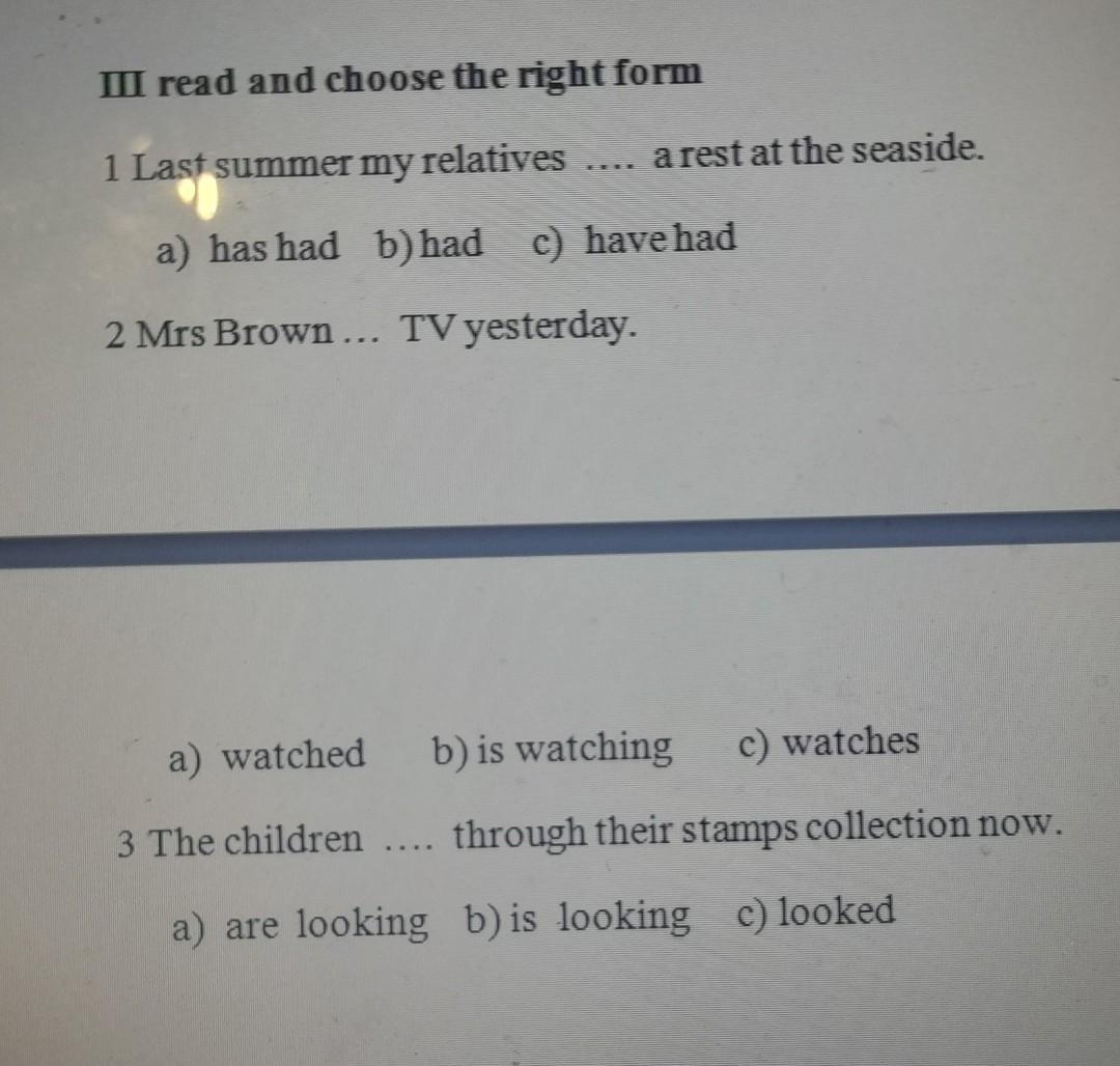1. Last summer my relatives.... a rest at the seaside. a) has had b) had c) have had