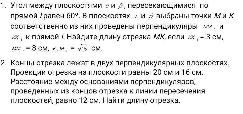 Угол между плоскостями α и β, пересекающимися по прямой L, равен 60°. В плоскостях α и β выбраны точки М и К соответственно из них проведены перпендикуляры ММ₁ и КК₁ к прямой L. КК₁=3см; ММ₁=8см; К₁М₁=√15см