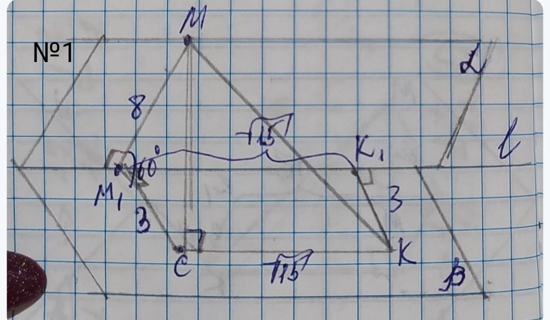 Проведём от точки М₁ отрезок М₁С параллельный КК₁ и равный 3см, получился линейный ∠ММ₁С=60° . Из точки М проведём отрезок МС ⏊ β. Получили прямоугольный треугольник ММ₁С с прямым углом МСМ₁. Найдём МС по теореме косинусов:
