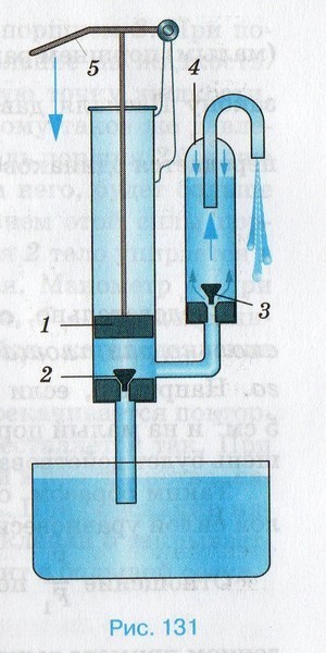 При ходе поршня вверх вода высасывается с глубины не более 10 метров, а дальше, при движении поршня вниз, клапан затыкается, и пристройкой вода поднимается поршневым давлением вверх - а его теоретически можно развивать сколь угодно большим
