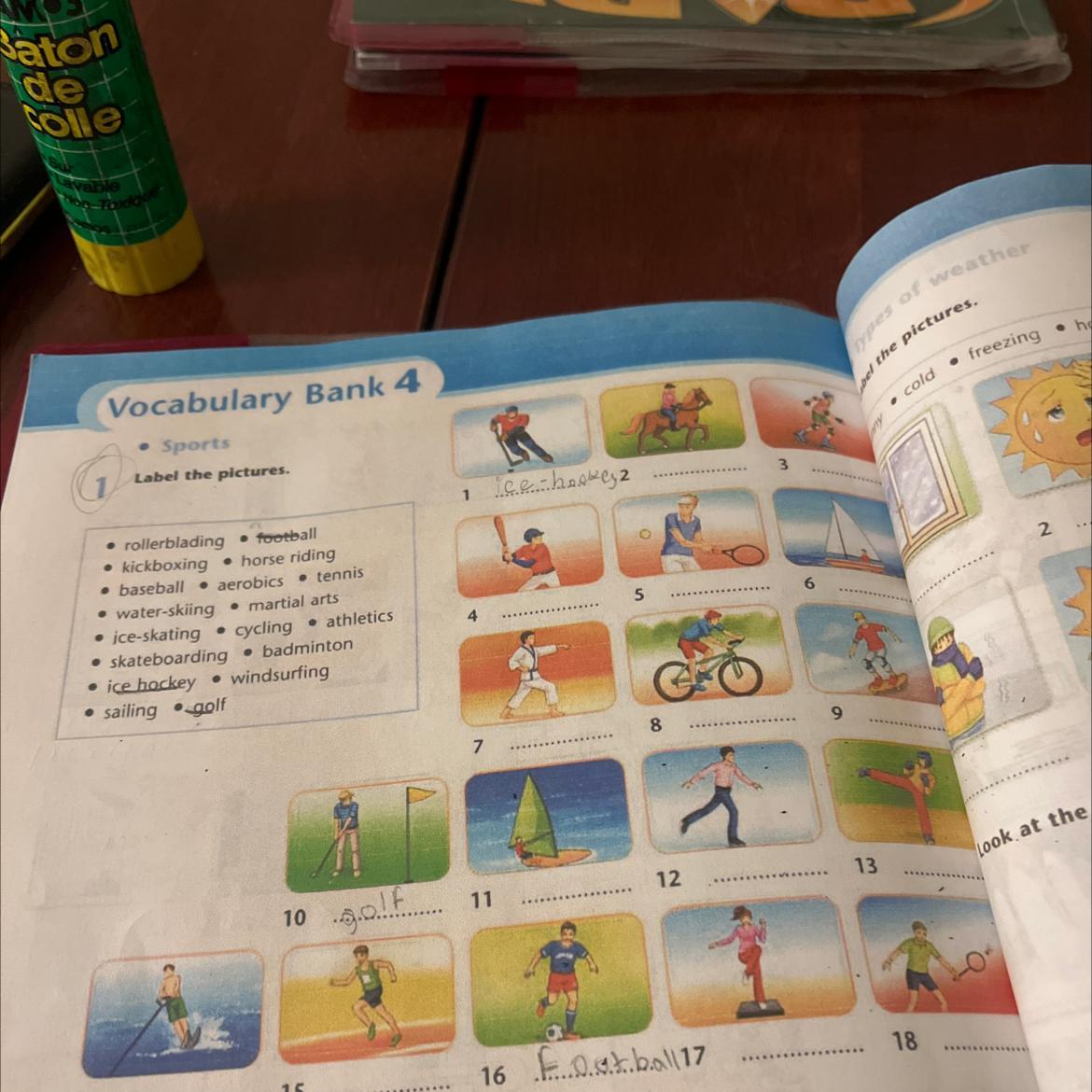 Объяснение:1-ice-hockey 2-horse riding 3-roller blading 4-base ball 5-tennis 6-water-skiing 7-martial arts 8-cycling 9-skateboarding 10-golf 11-sailing 12-ice-skating 13-kickboxing 14-windsurfing 15-athletics 16-football 17-aerobics 18-badminton.
