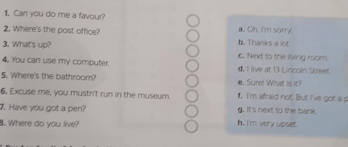 1. Can you do me a favour? 2. Where's the post office? 1 what's up? 4 You can use my computer & Where's the bathroom &xcuse me you mustrit n 7. Have you got a per & where do you live? run in the museum ood 00 a. Oh, I'm sorry c. Next to the twing room I live at 10 Lincon Street e. Surel What i tem afraid not But I've got a pendli It's next to the bark very upset