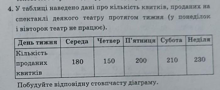 У таблиці наведено дані про кількість квитків проданих на спектаклі деякого театру протягом тижня (у понеділок і вівторок театр не працює).Побудуйте відповідну стовпчасту діаграму.1) обчисліть скільки квитків у середньому продавали кожного дня; 2)скільки відсотків становили продані квитки в п'ятницю від кількості квитків, що продали в неділю.