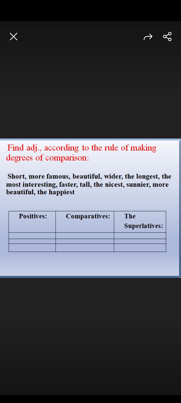 Positives: beautiful, sunnier, more beautiful, the happiest, more famous. Comparatives: short, the longest, faster. Superlatives: wider, tall, the nicest. Сори если есть ошибки но я старался