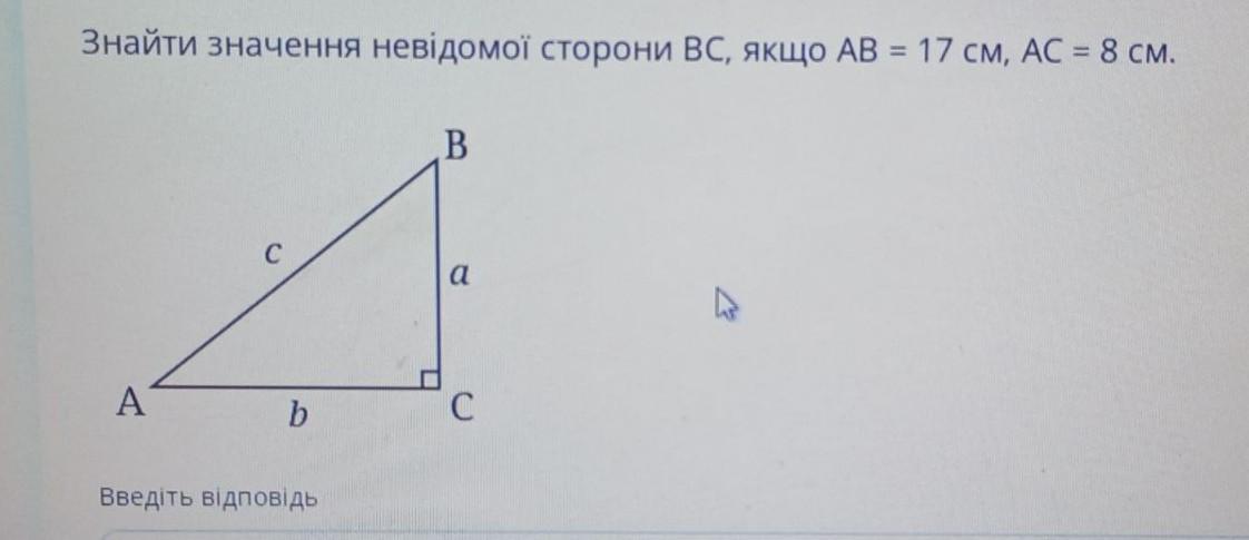 Знайти значення невідомої сторони ВС, якщо AB = 17 см, АС = 8 см.
