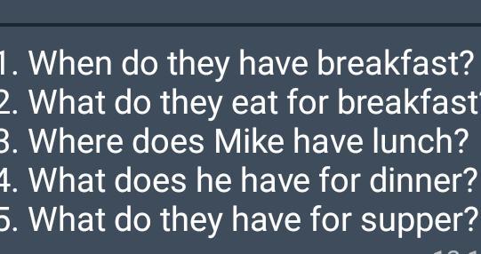 My family has breakfast at 8 o’clock. For breakfast we have porridge with milk or some sandwiches with a cup of tea or coffee.