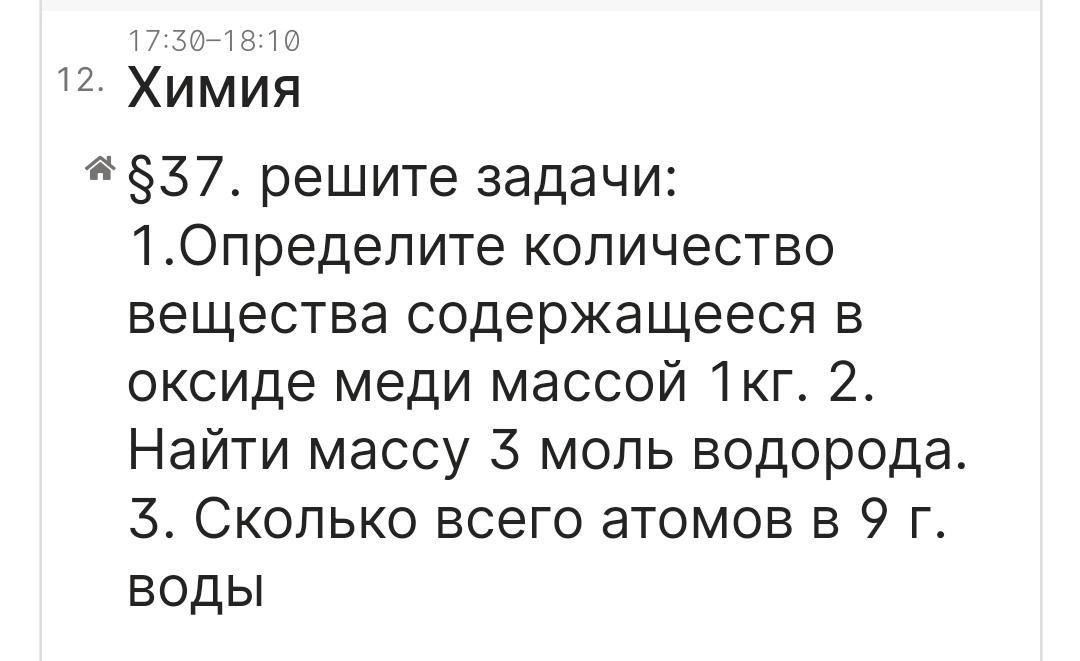 Помогите решить задачи: 1.Определите количество вещества содержащееся в оксиде меди массой 1кг. 2. Найти массу 3 моль водорода. 3. Сколько всего атомов в 9 г. воды