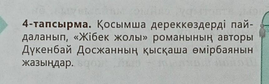 4-тапсырма. Қосымша дереккөздерді пай- даланып, «Жібек жолы» романынын авторы Дукенбай Досжанның қысқаша емірбаянын жазыңдар. 105 Бет(страница)4 тапсырма (задание)