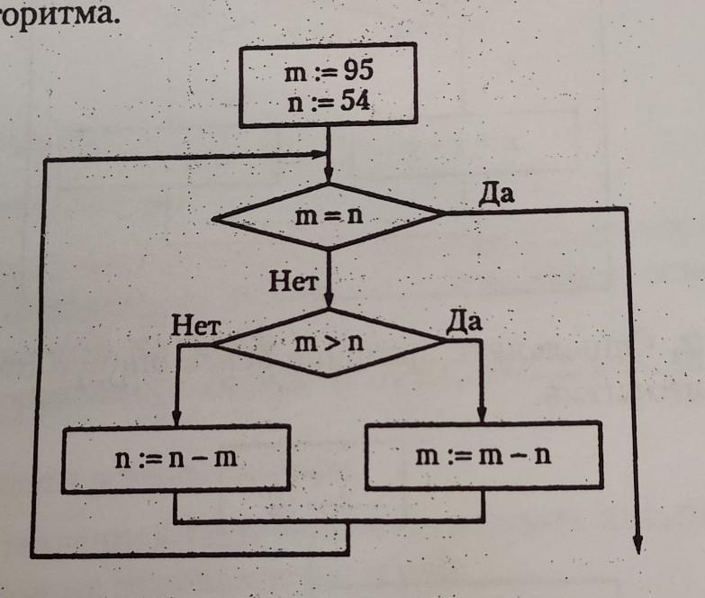 Пояснення: Перевірка чи дорівнює значення m значенню n, відповідь "Ні", потім перевірка чи більше значення m значенню n, відповідь "Так", потім йде математична дія віднімання, тобто 95-54