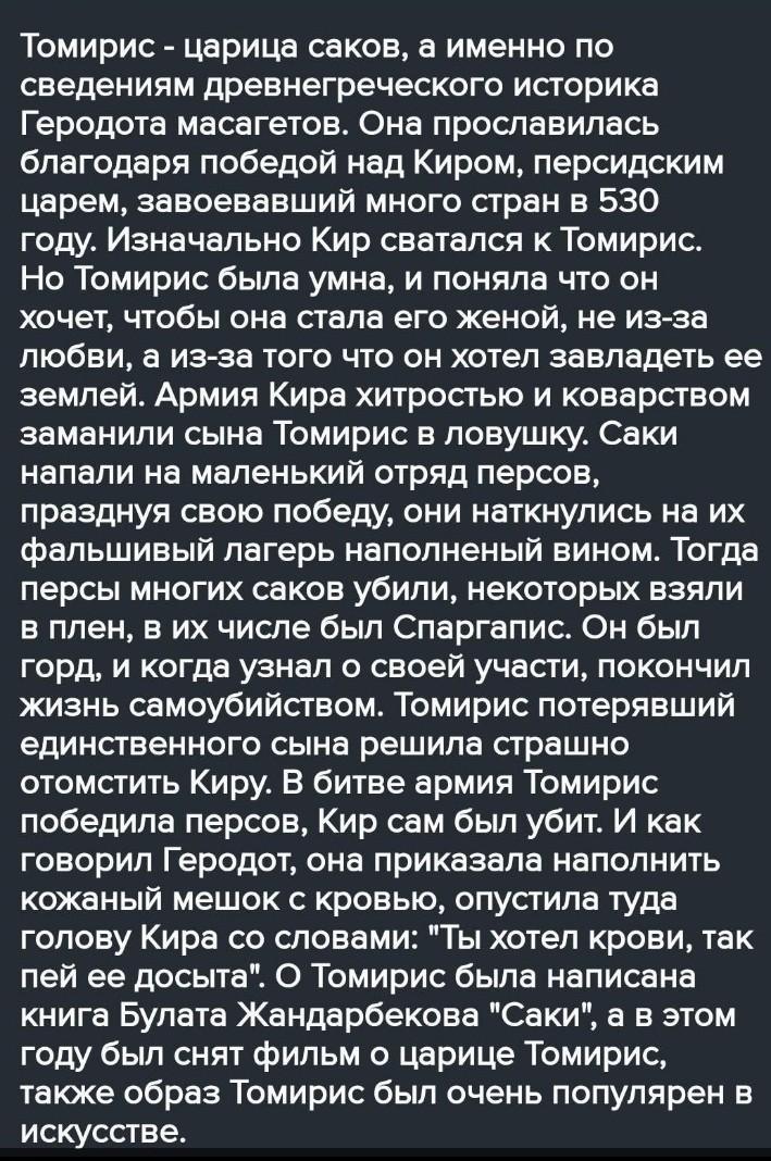 Вместе с наследником тиграхаудов Томирис правила массагетами после смерти отца. Супруг был сильным воином, но не разделял амбиции Томирис, утопал в праздности, разгуле и больше мешал массагетской воительнице, чем поддерживал ее. Только после его смерти она смогла в полной мере реализовать свои амбиции, создать могучее войско и победить жаждущего захватить новые территории царя Кира Великого. По легенде, Томирис приказала обезглавить поверженного царя. Воительница бросила голову Кира в бурдюк с человеческой кровью со словами «Ты жаждал крови, царь персов, так пей ее теперь досыта!»