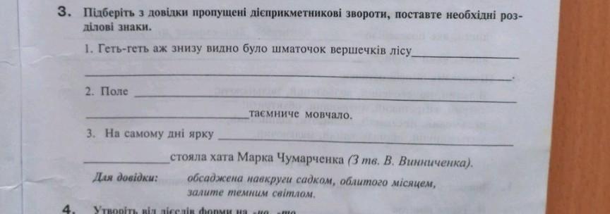 3. Підберіть з довідки пропущені дієприкметникові звороти, поставте необхідні роз- ділові знаки. 1. Геть-геть аж знизу видно було шматочок вершечків лісу 2. Поле 3. На самому днi ярку Для довідки: таємниче мовчало. стояла хата Марка Чумарченка (3 мВ. В. Винниченка). обсаджена навкруги садком, облитого місяцем, залите темним світлом.