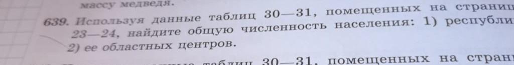 массу 639. Используя данные таблиц 30-31, помещенных на страницах 23-24, найдите общую численность населения: 1) республики; 2) ее областных центров. данные таблиц 30—31, помещенных на страницах 6.10 1 TE QUET