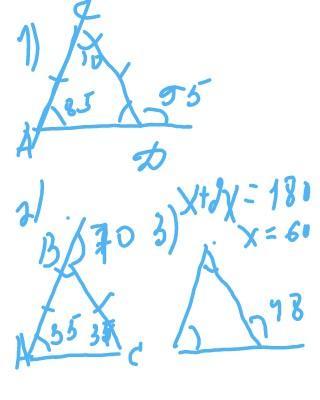 1. В треугольнике АВС, АС=ВС, угол С равен 10 градусам. Найдите внешний угол CBD. 2. В треугольнике АВС АВ=ВС. Внешний угол при вершине В равен 70 градусам. Найдите угол С 3. Один из внешних углов треугольника равен 48 градусам. Углы, не смежные с данным