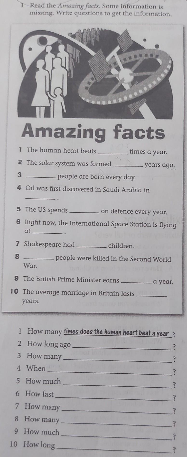 missing Write questions to get the information. Amazing facts 1 The human heart beats times a year # The solar system was formed 7 8 people are born every day. 4 Oil was first discovered in Saudi Arabia in 5 The US spends on defence every year. 6 Right now, the International Space Station is flying at Shakespeare had years ago. children. people were killed in the Second World War. 9 The British Prime Minister earns 10 The average marriage in Britain lasts years. 8 How many 9 How much 10 How long a year. 1 How many times does the human heart beat a year ? 2 How long ago P 3 How many 4 When 5 How much 6 How fast 7 How many