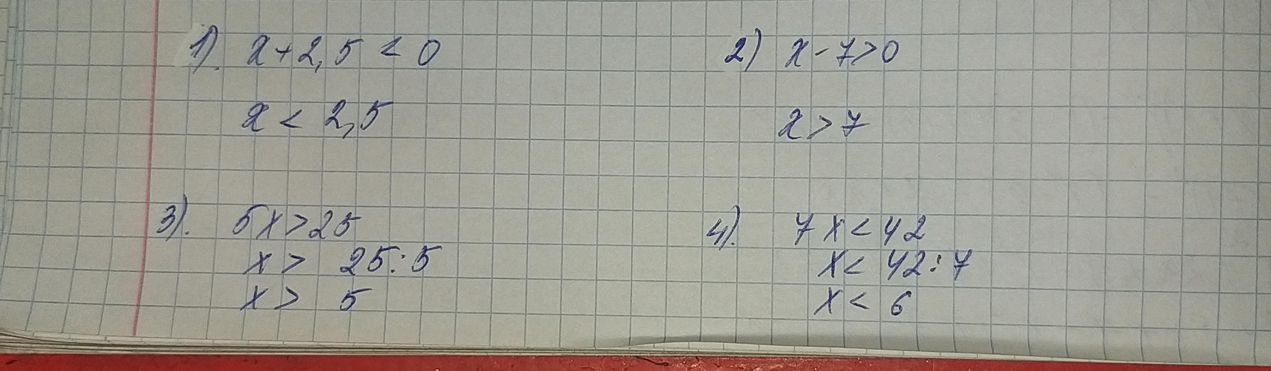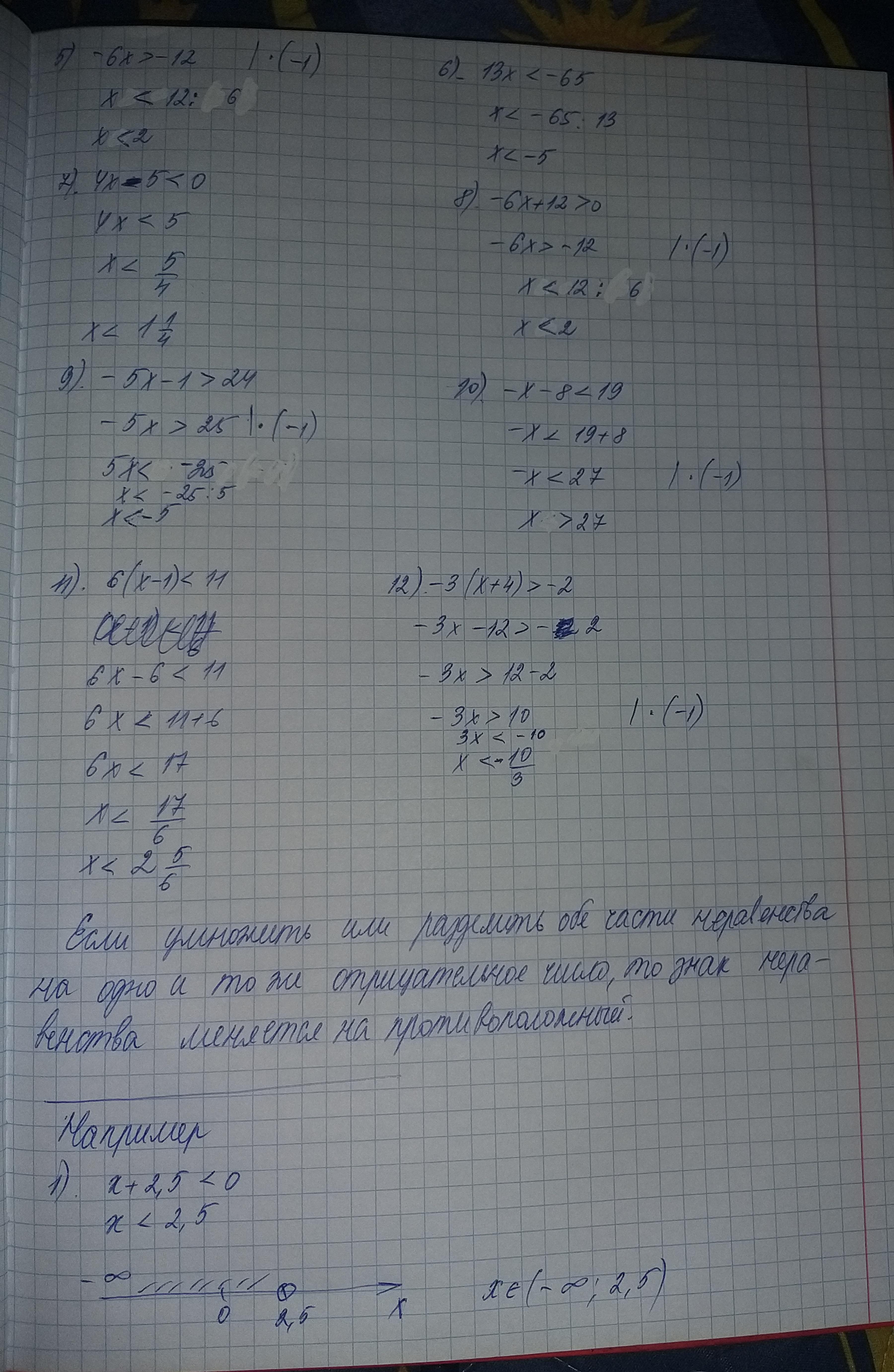 B) x + 2,5 < 0; r) x - 7> 0. B) 5x > 25; r) 7x < 42. B) -6x > -12; r) 13x < -65. B) 4x − 5 < 0; r) -6x + 12 > 0. B) -5x - 1 > 24; r) -x -8 < 19. B) 6(x - 1) < 11; r) −3(x + 4) > -2.