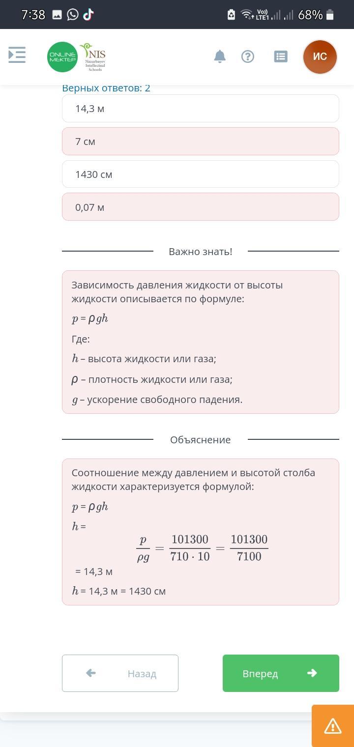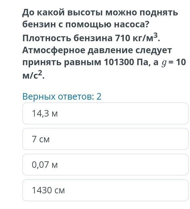 До какой высоты можно поднять бензин с помощью насоса? Плотность бензина 710 кг/м3. Атмосферное давление следует принять равным 101300 Па, а g = 10 м/с2. Верных ответов: 2 14,3 м 7 CM 0,07 м 1430 CM