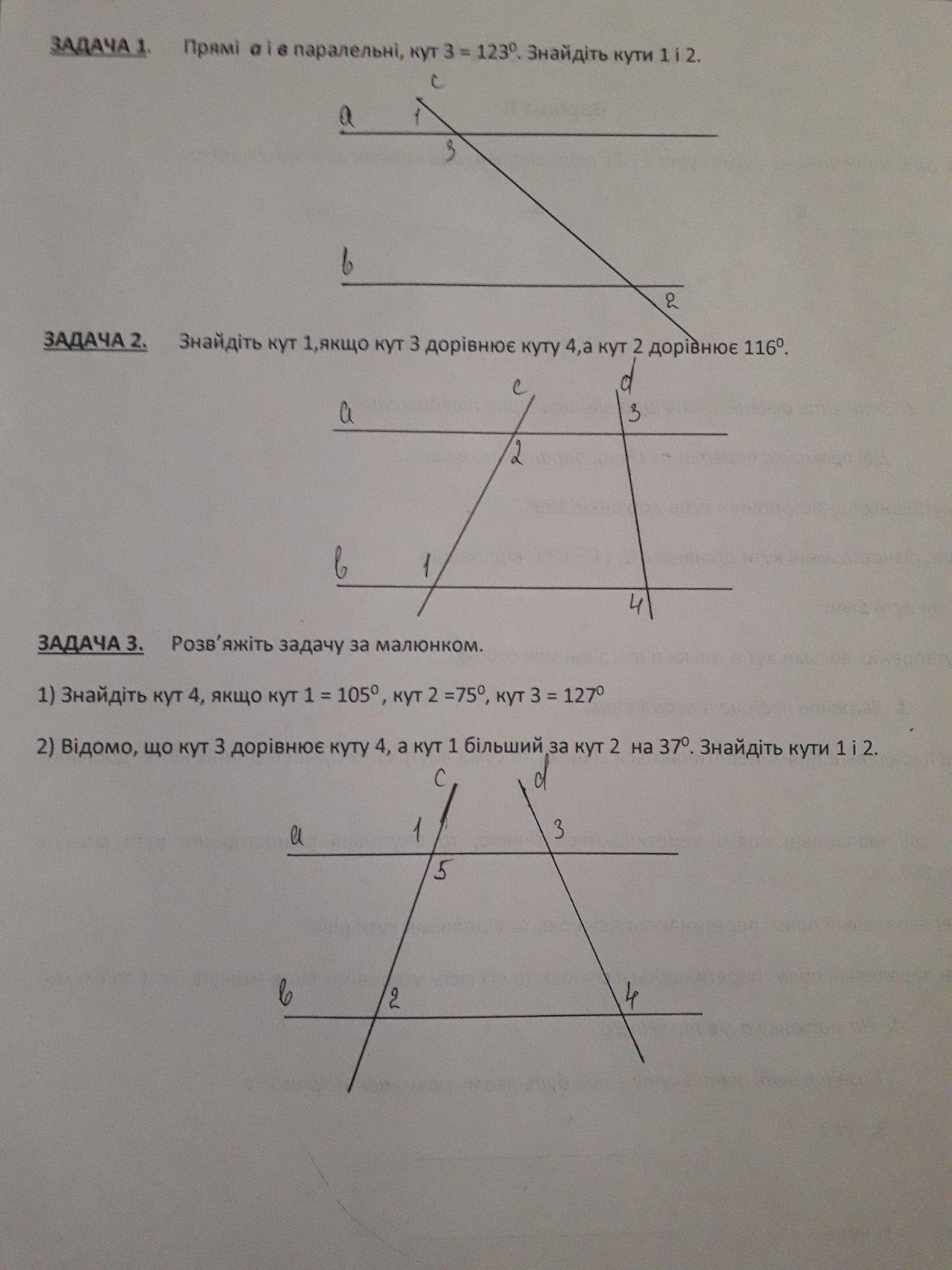 угол 1 и угол 2 равны 57° т.к. параллель делает углы смежными 180° а 180°-123°=57°
