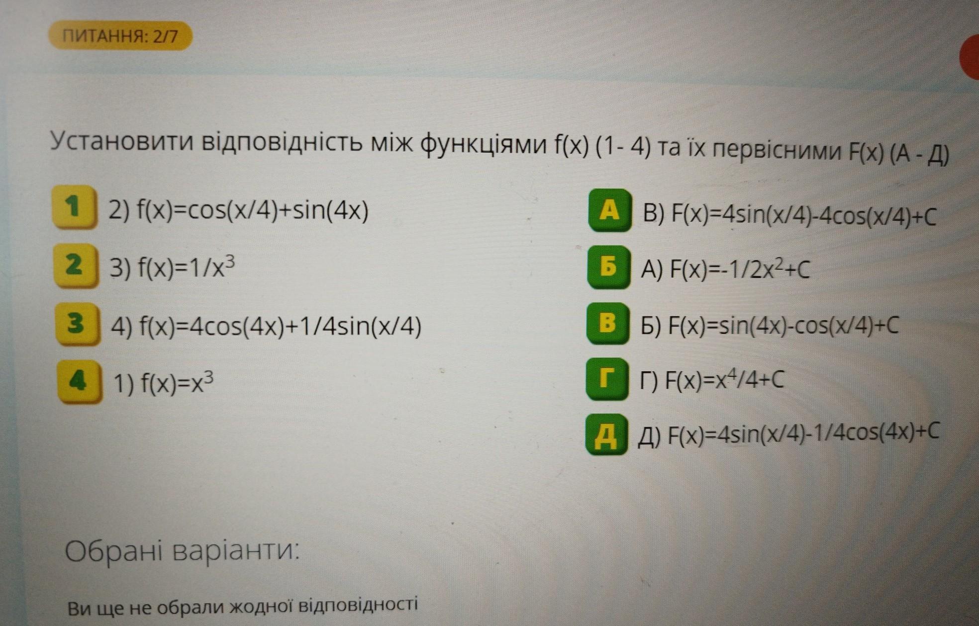 Установити відповідність між функціями f(x) (1- 4) та їх первісними F(x) (А - Д)